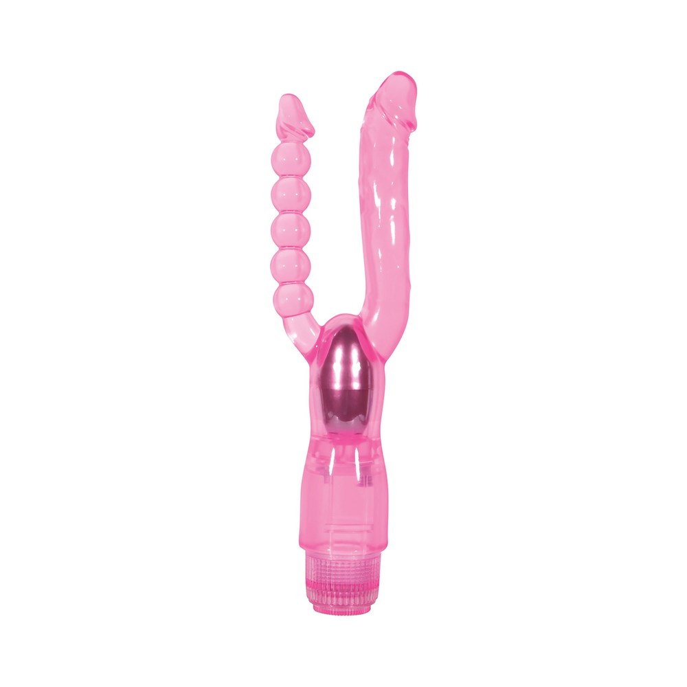 Double penetration Thermoplastic Rubber TPR jelly vibrator thrills in front with a realistic 4.75 inches shaft, 1 inch width, while in back a separate 4.5 inches string of six firm anal beads .65 inch width, massages your deepest backdoor hot spots. Powerful multi-speed vibrations buzz from the centrally located motor.Totally waterproof, the Adam Eve Dual Pleasure Vibrator is ready for adventures in the tub or shower. This vibe is compatible with both water based and silicone lubricants for a sensually slick ride. Vibrator requires 2 AA batteries, not included. Sold separately.