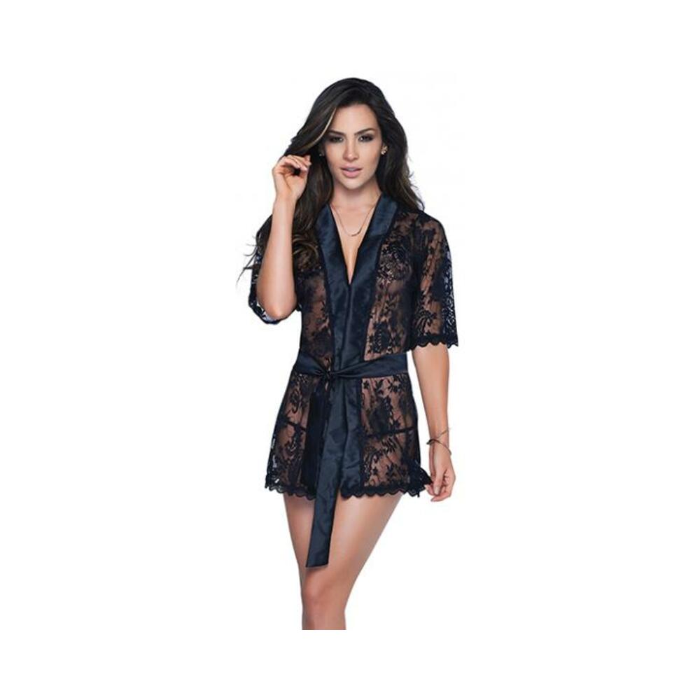 Comfort meets Sexy. Short lace robe with satin collar and belt, comes with matching G-String. 88% Nylon 12% Elastane / 88% Nylon 12% Elastane. Hand Wash. Do not Bleach. Do not Iron. Medium – Bust 36-38 inches. Waist 27-39 inches. Hips 37-39 inches.