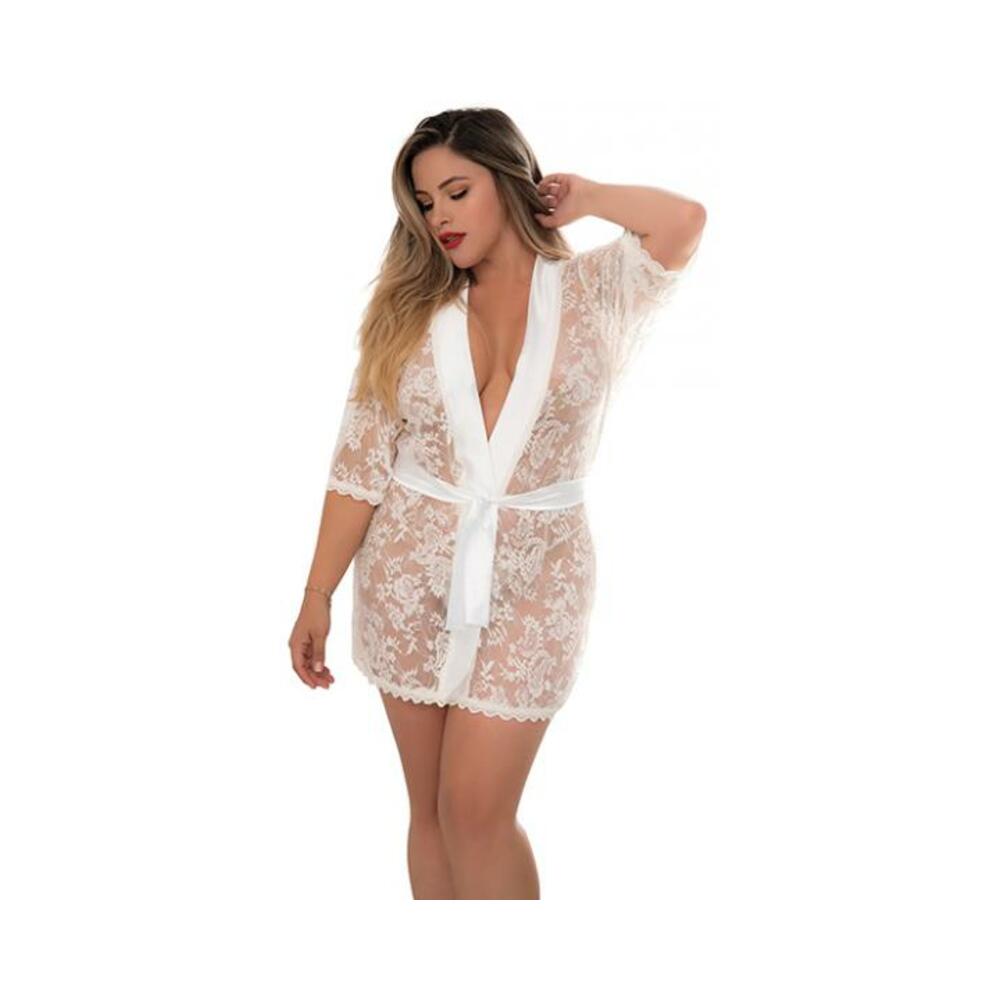 Comfort meets Sexy. Short lace robe with satin collar and belt, comes with matching G-String. 88% Nylon 12% Elastane / 88% Nylon 12% Elastane. Hand Wash. Do not Bleach. Do not Iron. 2X-3X – Bust 48-51 inches. Waist 37-39 inches. Hips 47-49 inches.