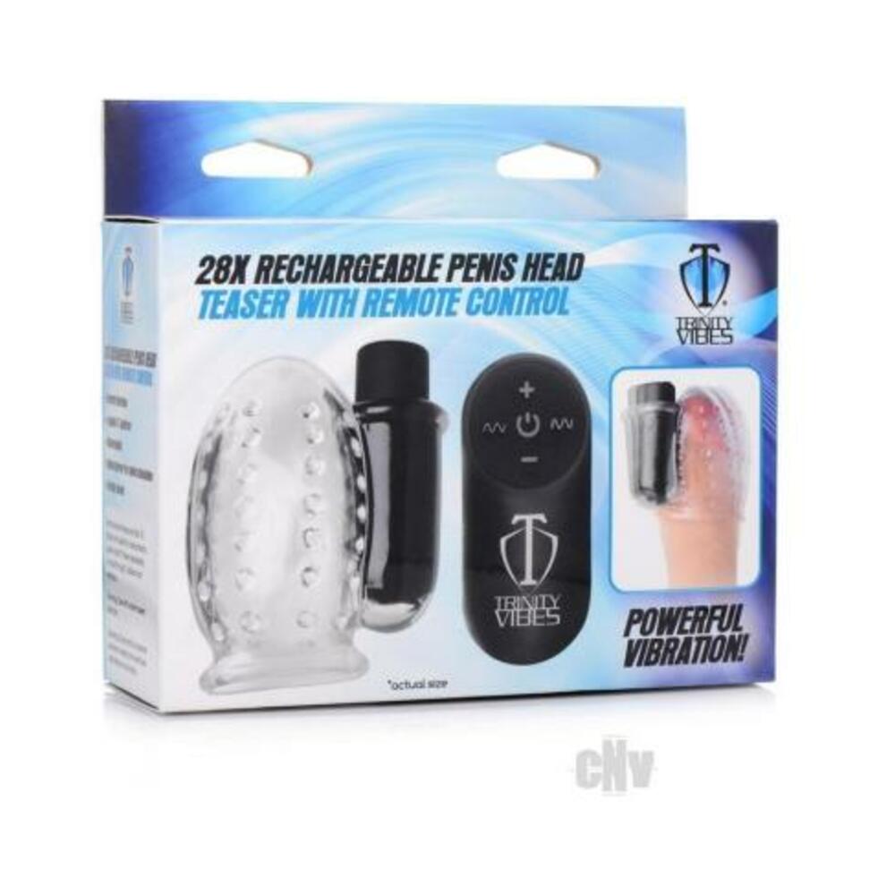 Designed to stimulate and tease! Secure this Head Teaser on yourself or your partner and buzz the tip of penis for a more intense form of foreplay or personal pleasure – perfect for using on your partner while they are tied up and vulnerable. Choose from 4 speeds and 7 patterns of vibration to play with, controlled via included wireless controller! The interior of this head teaser features textured nubs for a more intense sensation! The soft and flexible TPE material is compatible with water basd lubricants and stretches to fit most sizes. Measurements: Length 3 inches, width 2.4 inches Materials: TPE, ABS Plastic Color: Black 28X Rechargeable Penis Head Teaser w/ Remote Specs: Designed For Intense Teasing: Restrain you man and enjoy watching him wriggle and squirm against the electrifying power of the included bullet vibrator Remote Controlled Bullet: Choose from 4 speeds 7 patterns of vibration to make his toes curl; flip through each function with the included wireless controller for convenient stimulation Stretchy Material Fits Most: Designed with a soft and flexible TPE that is plush and stretchy to fit most sizes; the soft material features internal massage nubs for a more intense sensation Waterproof and Rechargeable: The included bullet vibe is rechargeable with the included USB cable, and designed with IPX6 splashproofing for ease of cleaning and show friendly fun